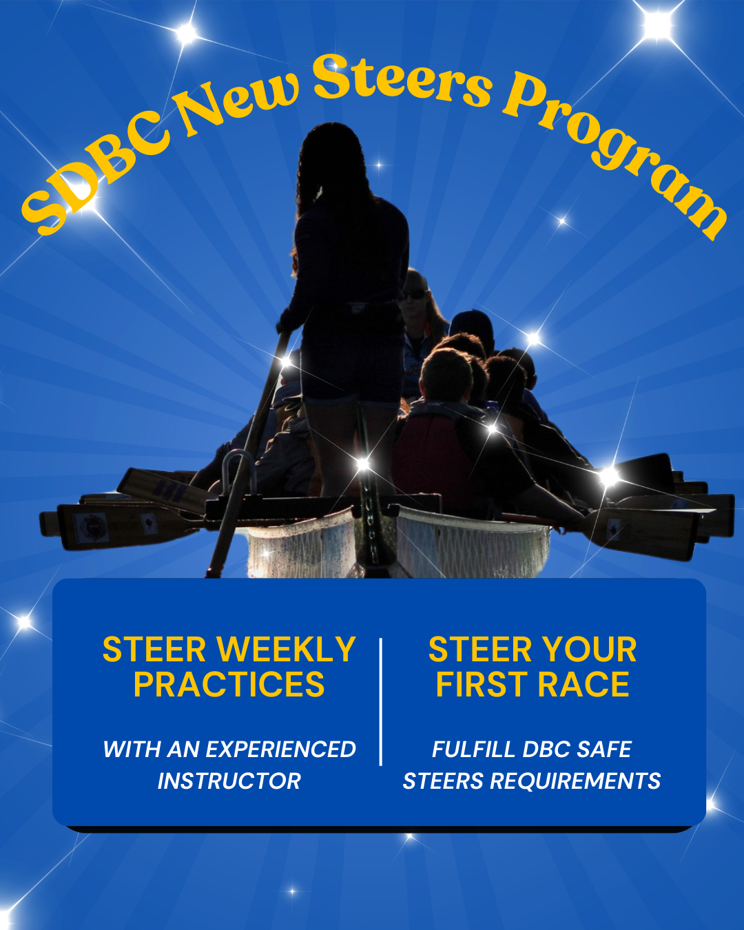 Our SDBC New Steers Program can accept up to two participants per season. Each participant will attend practices on alternating Mondays. Our experienced coaches will help the new steers develop skills and confidence over the summer. New Steers Program participants will have the opportunity to steer for the SDBC teams at local festivals.